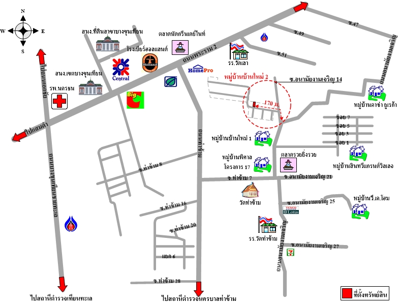 การเข้าถึง : ถนนพระราม 2 จากแยกสุขสวัสดิ์มุ่งหน้าแสมดำ ผ่านโรงเรียนวัดเลา และโฮมโปร พระราม 2 เลี้ยวซ้ายเข้าถนนท่าข้าม เลี้ยวซ้ายเข้าซอยท่าข้าม 7 ผ่านวัดท่าข้าม จากนั้นเลี้ยวซ้ายเข้าถนนอนามัยนาเจริญ ผ่านหมู่บ้านพิศาล โครงการ 17 และหมู่บ้านบ้านใหม่ 1 จากนั้นเลี้ยวซ้ายเข้าซอยอนามัยงามเจริญ 14 และเลี้ยวซ้ายเข้าถนนภายในหมู่บ้านบ้านใหม่ 2 รวมประมาณ 170 ม. จะพบทรัพย์สินตั้งอยู่ด้านขวามือ