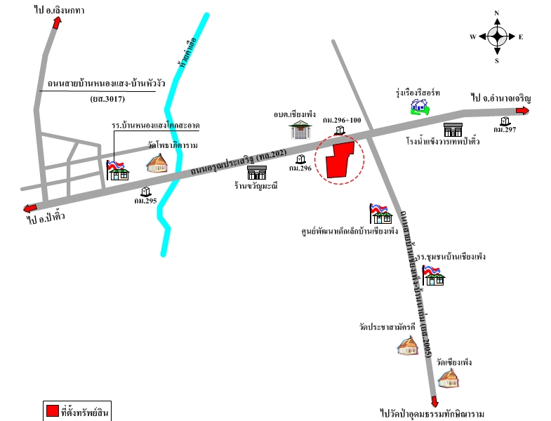 การเข้าถึง : ถนนอรุณประเสริฐ (ทล.202) จากอำเภอป่าติ้วมุ่งหน้าจังหวัดอำนาจเจริญ ผ่านโรงเรียนบ้านหนองแสงโคกสะอาด วัดโพธาภิตาราม และองค์การบริหารส่วนตำบลเชียงเพ็ง ถึง กม.296+100 จะพบทรัพย์สินอยู่ด้านขวามือ